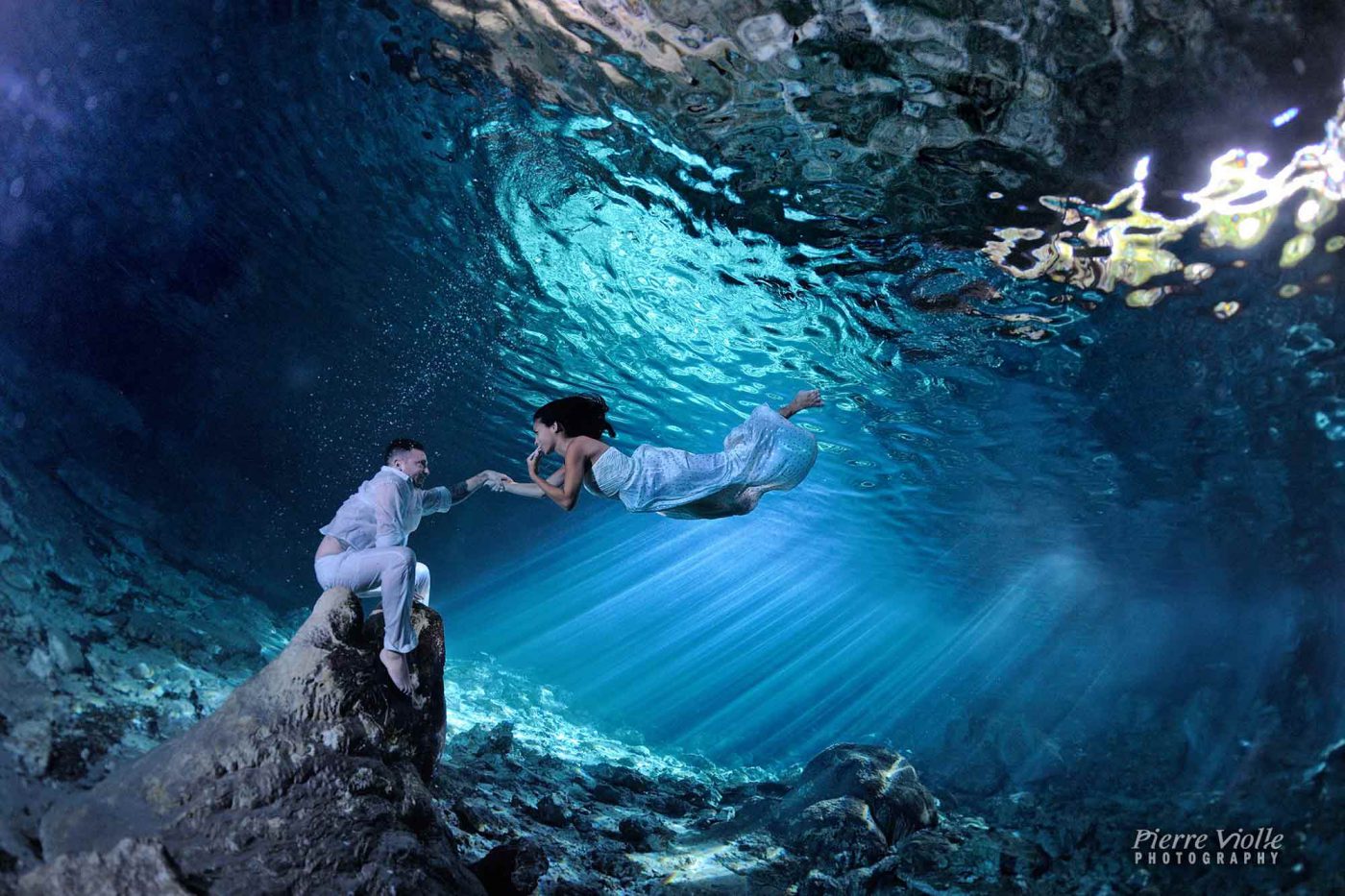 Carolina&Joe Honeymoon underwater trash the dress at cenote Dos ojos